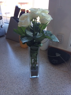 Vi har prøvet at sætte blomster i en af vaserne, hvor vi havde lagt grå sten i.