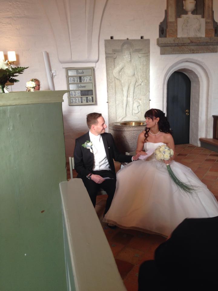 Efter den salme begynder præsten på sin tale og her bliver det rigtig sjovt. Vores præst er så frisk, frimodig og sjov, så talen er meget personlig og der er ilagt humor. Hun siger alle de rette ting. Min H2B og jeg kigger på hinanden rigtig meget og mimer til hinanden ’så er det nu’ og mit hjerte hamrer. For det er netop nu at præsten fortæller omkring hvordan min H2B og jeg er kommet i dag for at få vores kirkelige velsignelse, da vi for allerede 1 år siden valgte at sige ja til hinanden på rådhuset. Der går en mumlen igennem kirken og alle kigger på hinanden. Min far sidder ved siden af og kigger og udbryder så ”WHAT” og vi smiler bare alle sammen og alle er bare dybt overrasket og chokeret. Min MAND og jeg har nemlig holdt det hemmeligt for ALLE hele det sidste år at vi allerede havde giftet os. Kun 2 tilfældige vidner inde på borgerservice, ham der viede os og præsten har været bevidst om dette. Vi har været SÅ nervøse for hvordan det ville blive modtaget, specielt af den tætte familie og de tætteste venner. Men alle var bare kun positivt overrasket og synes det havde været så fedt at vi tog fusen på dem alle sammen, på den måde!