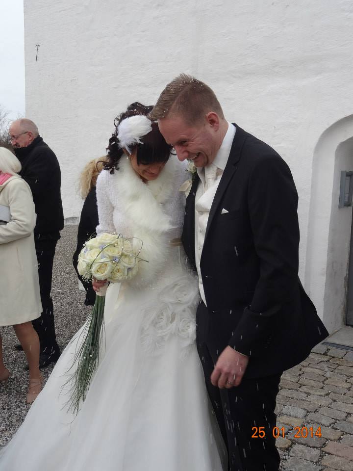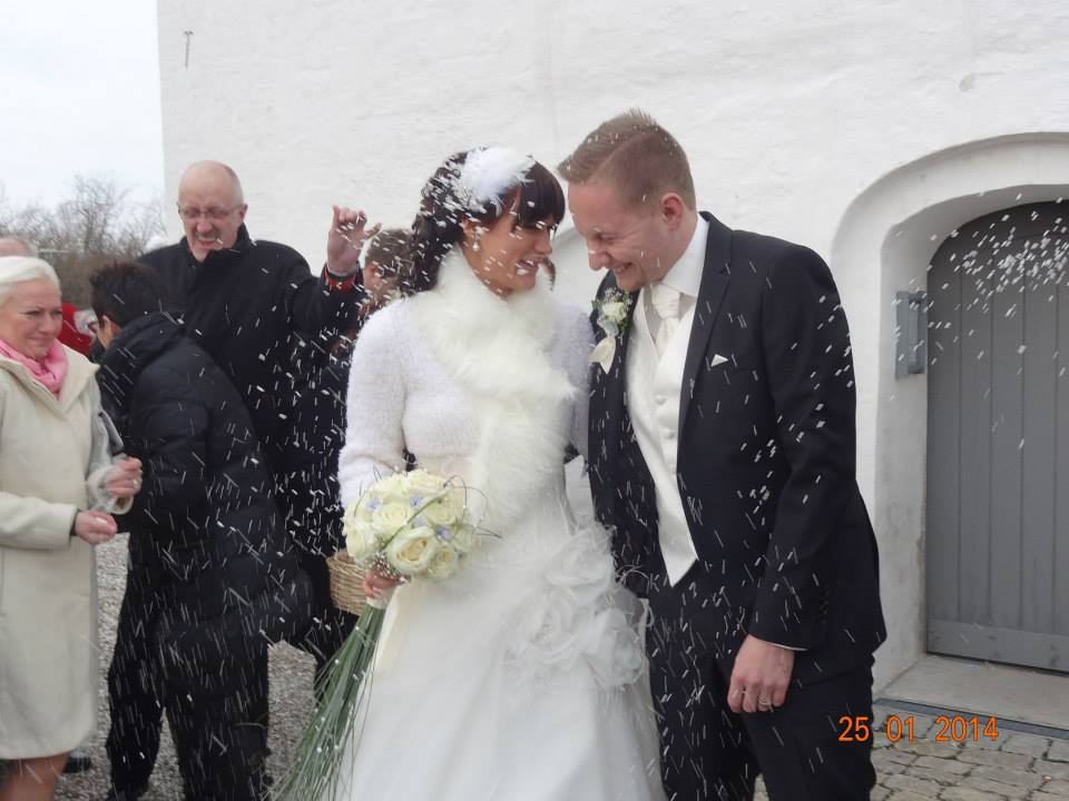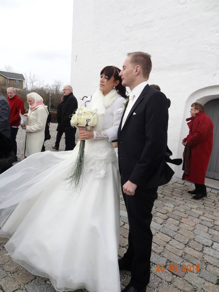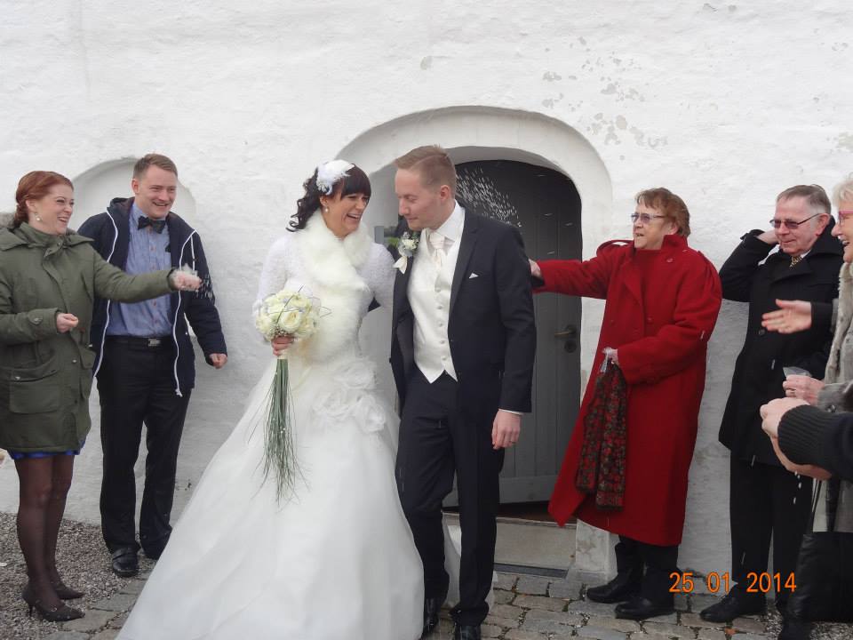 Da hele ceremonien er færdig, rejser vi os og går ud af kirken, stiller os i våbenhuset for at gæsterne kan ønske os tillykke, men der går lang tid før folk opfatter det som at de skal komme hen og ønske tillykke, hehe…..alle gæsterne samler sig bare, fordi ingen vil gå udenfor i kulden.