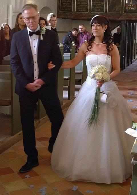 Vi træder alle ind i våbenhuset og jeg får min bolero m.m. af og får spurgt mine brudepiger om hvor min brudebuket osv er. De kigger på mig undrende 'den har de da ikke fået'. Ihh altså...godt jeg havde snakket med svigermor, for jeg vidste at den lå under en dug på stolene i våbenhuset, sådan at ingen af gæsterne ville komme til at se dem, før jeg træder ind i kirken. Jeg får min brudebuket og den er ALT hvad jeg havde drømt om og mere til. Den er så smuk! Hvide roser og langt græs langs håndtaget. Og min lille something blue perle med bryllupsdato er sat i toppen imellem blomsterne. Min far får sin knaphulsblomst og brudepigerne ders buket. Blomsterpigerne får deres kurv med rosenblade og min datter synes da de skal smides allerede nu, så hun vender lige bunden i vejret på sin kurv, så alle rosenbladede ligger på gulvet i våbenhuset. Flot! Nå, far og min søster samler dem op og vi stiller os an. Blomsterpigerne forrest og brudepigerne bagefter. Prøver så at få spurgt degnen om der vil være en bestemt musik til pigerne og så 'here comeback the bride' til mig og om vi får tegn til hvornår vi skal gå osv. Tror han var stokdøv, for måtte MANGE gange prøve pænt at få hans opmærksomhed....ham..stressfaktor lige her inden vi skal ind. Men vi vil få tegn. Så åbnes dørene og musikken går i gang til pigerne, som stille og roligt går ind. Var meget spændt på hvordan min datter specielt ville klare opgaven, men tror hun havde øvet sig mentalt op til eller i dagplejen eller noget, for hun klarede det lige sådan som hun skulle. Alle beundrede de skønne små tøser og deres charme.