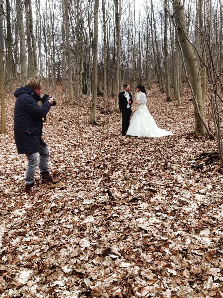Det blev et sted tæt på, hvor der går en flot smal vej i en skov. Vi skulle så ind i skoven og stå imellem de høje flotte træer i skovens bund. Heldigvis var jorden helt frossen, så jeg sank ikke i og det var ikke smattet på nogle måder. Det var SÅ smukt og fedt at opleve og kulden holdte vi ud. Der gik en lille time med fotograferingen og så var det altså blevet så koldt for os at vi valgte at stoppe og køre videre til festen. Glæder mig helt sindssygt til at få alle billederne fra fotografen, så skal I nok få mange flere, men lige her et enkelt som fotografens kone tog med mobilen. Det er RHbilleder der er fotograen.