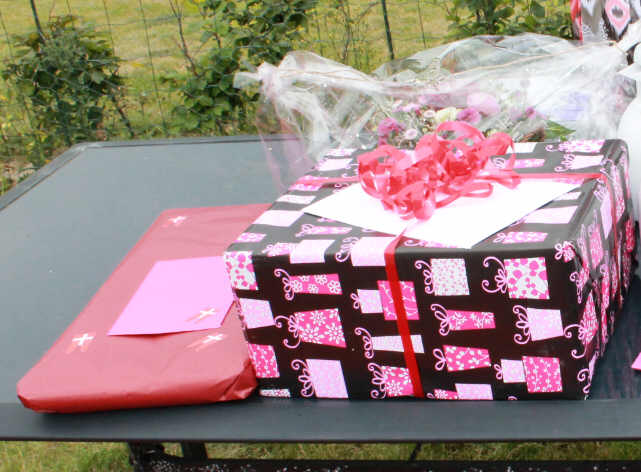 Udenfor teltet havde vores almindelige have bord, tjent som gavebord. Jeg ved ikke, lige hvad jeg havde forestillet mig, men jeg tror jeg havde tænkt at de 12 mennesker jo ikke ville medbringe 117 gaver, så enden af buffettbordet, kunne jeg jo nok bruge, hvis nogen havde gaver med til os. Jeg vidste godt at vi selvom der i invitationen var skrevet, at vi faktisk ikke rigtigt havde ønsker, ikke ville kunne slippe for et par. Vi havde lavet et lille digt hvor der stod, at hvis folk absolut ikke kunne lade være så var gavekort vejen at gå. Jeg har det liiiidt svært med gaver og ville faktisk hellere at folk bare ignorerede og dukkede op i stedet.